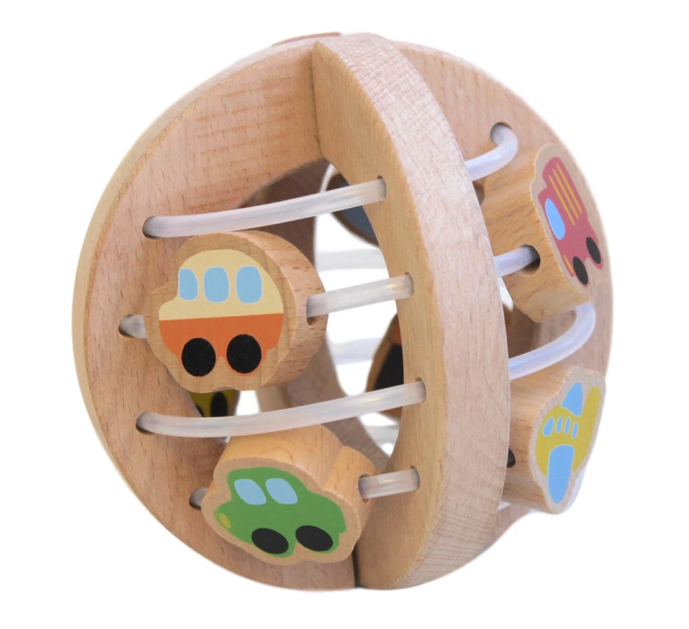 The Discoveroo Wooden Play Ball is a 12cm diameter ball made from beech wood with traffic shapes that spin around a plastic cord.