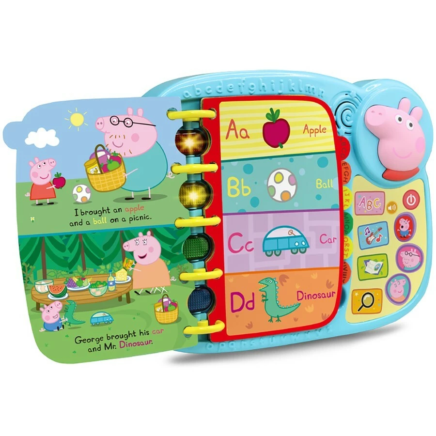 Peppa Pig talks all about her day with family and friends in the Peppa Pig Learn & Discover Book. Hear Peppa read the story with fun sounds and phrases in the real voices of Peppa, Mummy Pig, Daddy Pig and George. Peppa Pig introduces all the letters of the alphabet with vocabulary words from the story. This 14-page interactive book includes search-and-find games with letters and objects on each page. The Learn & Discover Book is easy to use and encourages a love of reading in young story lovers.