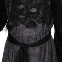 - Fishnet Hooded robe with tattered hem at base and trumpet sleeves
